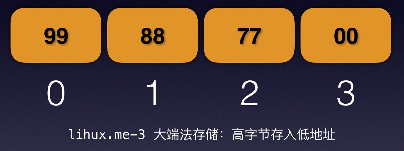按照我们视觉上从左到右的阅读习惯,我们会很自然的按照99 88 77 00的顺序存储它们:而这就是所谓的大端法(big-endian):高字节存入到底地址(当然你也可以说是:低地址存高字节)